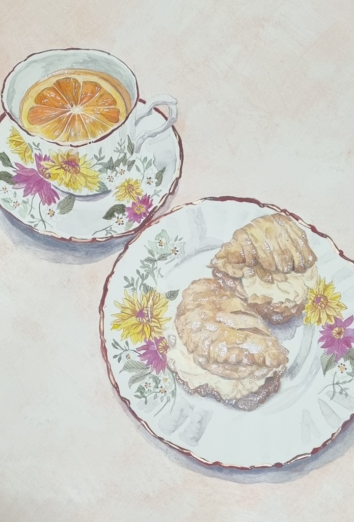 This was a quick but fun little challenge. I have not really got into still life painting, but thought that I should give it a try – and hey, I was forced to eat some mini apple turnovers!. This is a mostly watercolour artwork (Daniel Smith and a little Gansai Tambi) but I did finish off the turnovers with pencil. A little white gel pen was also used for the highlights (then toned down with coloured pencil).